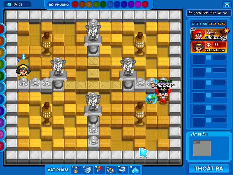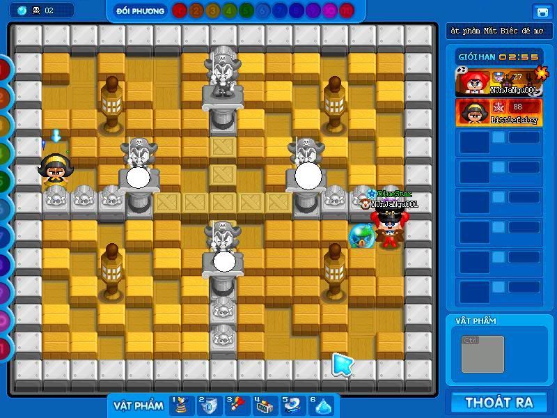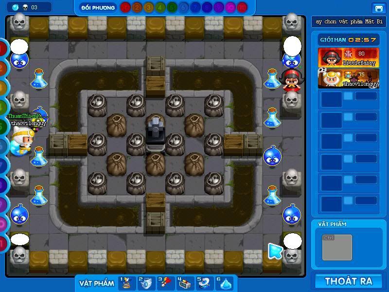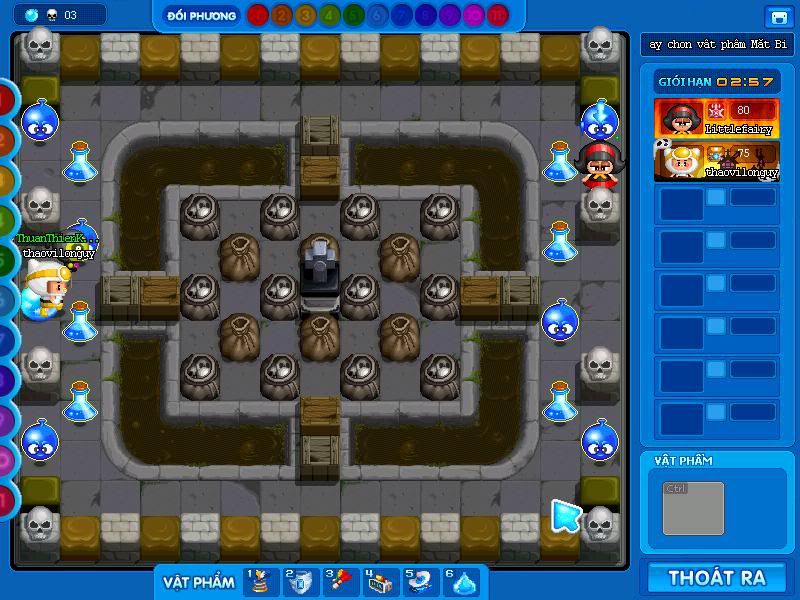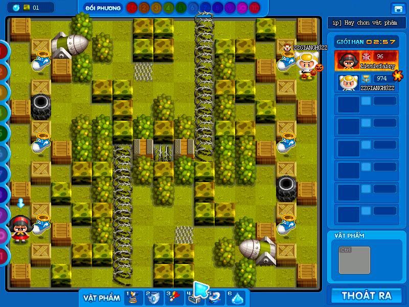- Nếu bạn đi 2, 3 : Khi phá ô gạch , bạn nên để 1 người ăn đồ nhiều hơn , và người này sau khi ăn đồ , sẽ nhảy qua bên đối phương 1 cách nhanh nhất, để có thể ép đối phương. Trong khi đồng đội đang ép đối phương, người còn lạii tiếp tục phá ô gạch để tìm đồ ăn , và ko cho đối phương ăn đồ . Sau khi đã xài hết khiên và kim, bạn nên chạy về phía xuất phát và để đồng đội của bạn xử lý típ . Thắng hay thua tuỳ thuộc vào kỹ thuật của bạn .